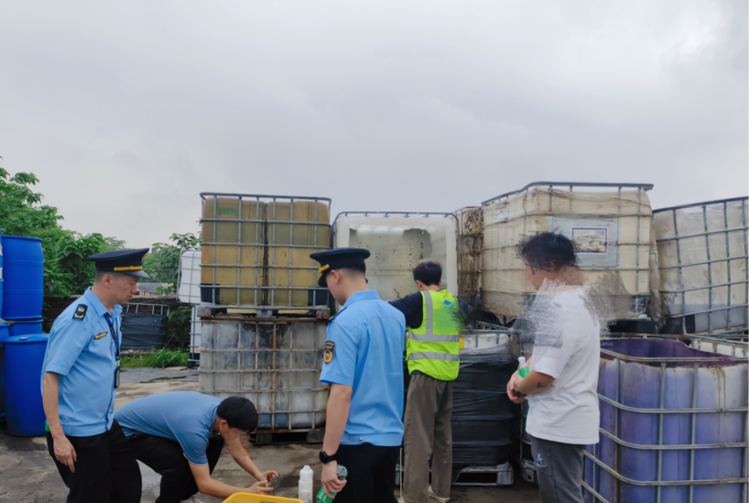 图为执法人员现场检查危废转移运输使用的吨桶、铁桶和塑料胶桶